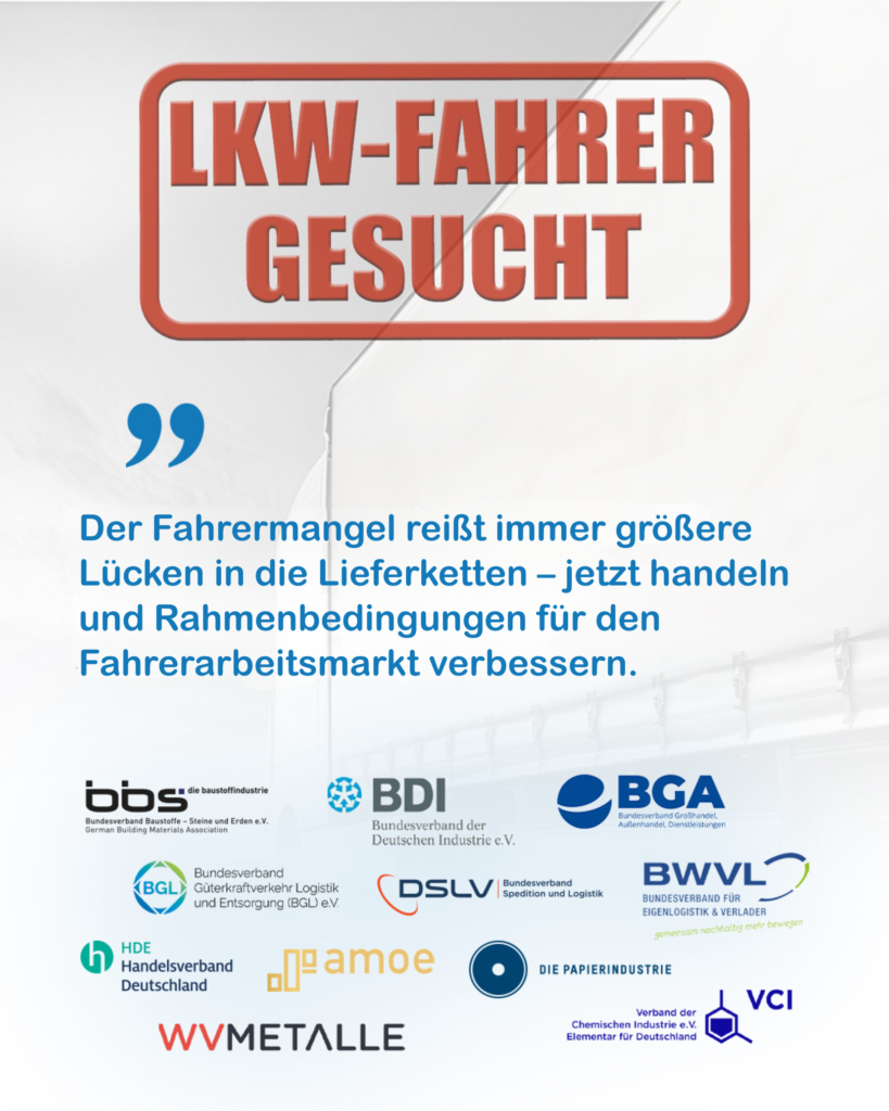 Eine breite Allianz aus elf führenden Wirtschafts- und Branchenverbänden hat einen gemeinsamen Weckruf zur Bekämpfung des Fahrermangels im Straßengüterverkehr gestartet. Der zunehmende Mangel an Berufskraftfahrerinnen und -fahrern gefährdet bereits heute die Stabilität der Logistikketten und damit die Versorgung von Wirtschaft und Gesellschaft.